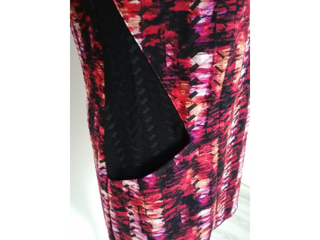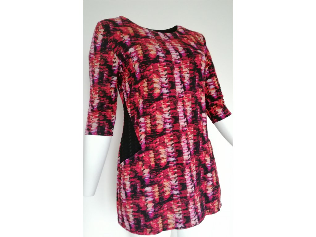Úpletová, červeno-černá tunika s 3/4 rukávem od českého výrobce Sabatti. Tunika má na bocích černé vsadky s kapsami, na zadním díle je v pase mírně projmutá dvěma záševky. K tunice můžete nosit buď legíny nebo úzké džíny, materiál je příjemný, nemačkavý úplet - 93%viskóza, 7% elastan.